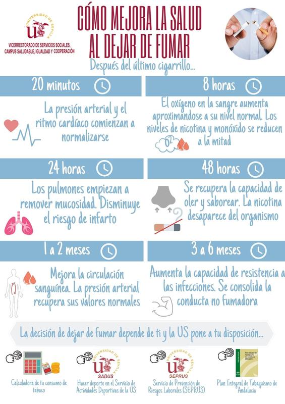 A més, a través d'infografies publicades en les xarxes socials, us oferim informació útil sobre els efectes nocius del tabac i de l'exposició passiva al fum, a més d'oferir informació sobre què ocorre en el nostre cos quan consumim tabac, quin efecte té en la nostra salut quan ho deixem en funció del temps, així com diversos recursos per a motivar-nos a deixar de fumar.