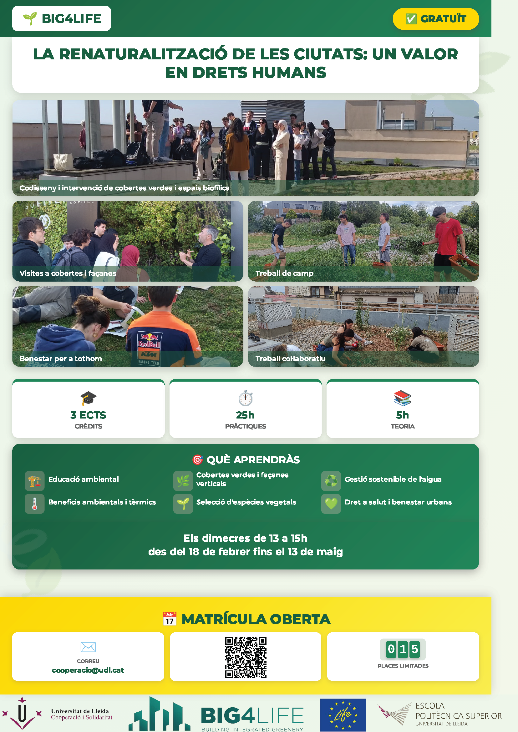 Curs pràctic dirigit a tot l'estudiantat de la Universitat de Lleida, per fe efectiva una de les estratègies més potent en la lluita contra els efectes negatius del canvi climàtic. Es tracta de la renaturalització de les ciutats a través de la construcció de cobertes i façanes verdes que permeten integrar vegetació a l'envolupament dels edificis, aprofitant així els espais de l'entorn urbà. Aquestes tècniques, tenen un efecte directe sobre la salut i el benestar de les persones afavorint l’activitat física en espais sostenibles climàticament, entre altres. Així mateix són espais de socialització de primer ordre, en els que es poden dur a terme múltiples activitats de tipus participatiu, d’integració social i d’educació i aprenentatge.