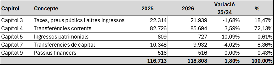 Descarregar pdfEl Consell de Govern de la Universitat de Lleida (UdL) ha aprovat avui la proposta de pressupost per al 2026, que puja fins els 118,8 milions d'euros, el que suposa un augment de 2,1 milions (1,8%) respecte d'enguany. "L'actual equip de govern ha assumit la proposta de l'anterior per poder-la presentar dins del termini establert, ja que no fa ni un mes de la presa de possessió", ha explicat la gerenta de la UdL, Maite Calderó. Per a l'aprovació definitiva dels comptes cal el vistiplau del Consell Social, que es reunirà el proper dimarts, 23 de desembre.