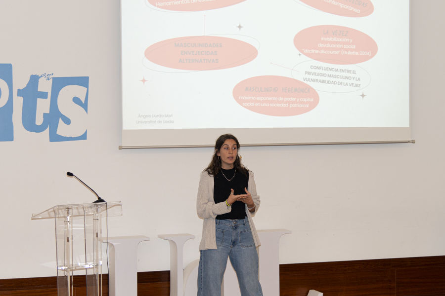 La doctoranda de la UdL, amb la tutoria de les professores Maricel Oró i Isabel Santaulària, treballa en el paper de la literatura com a eina de canvi social analitzant autors britànics i dels Estats Units. "La vellesa obre la possibilitat d'un replantejament de les masculinitats i els relats de ficció faciliten la normalització de models alternatius que s'allunyen dels valors nocius, hegemònics i patriarcal", ha explicat durant la seua presentació a la semifinal celebrada a la Facultat d'Educació, Psicologia i Treball Social de la UdL.