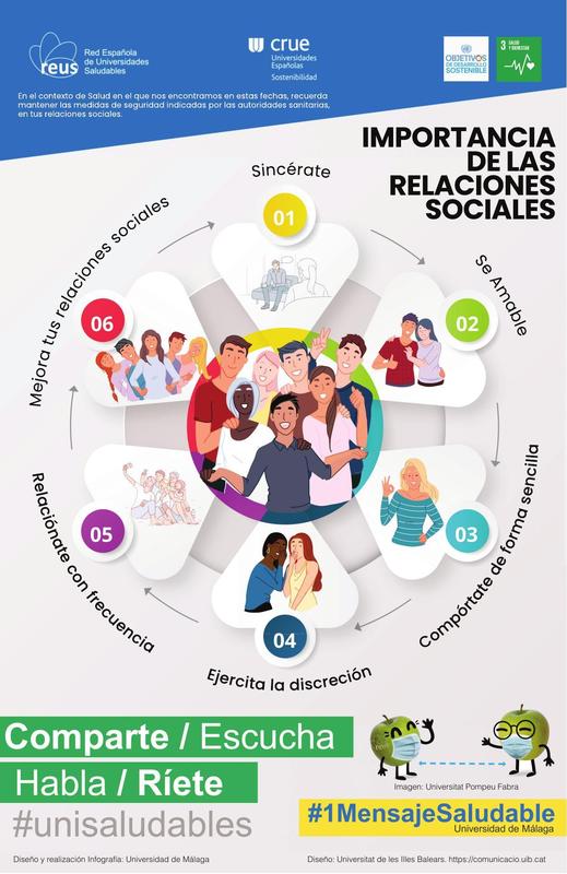 El mes de juliol, des de la Universitat de Màlaga i la Xarxa Espanyola d'Universitats Promotores de Salut (REUPS), volem llançar aquest missatge sobre la importància de les relacions socials i oferim algunes estratègies per a relacionar-nos de manera adequada.