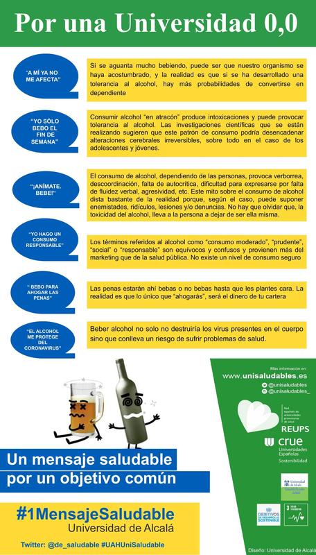 Des de la Universitat, t'animem a aconseguir el repte de fer una Universitat 0,0. Pensa alternatives d'oci saludable per a gaudir amb els teus cinc sentits i comparteix-les amb els teus companys i companyes (sal a córrer, feix ioga, cuina, aprèn a ballar…). Et faran sentir bé amb tu mateix i aprendràs que no necessites consumir cap substància per a passar-ho bé.