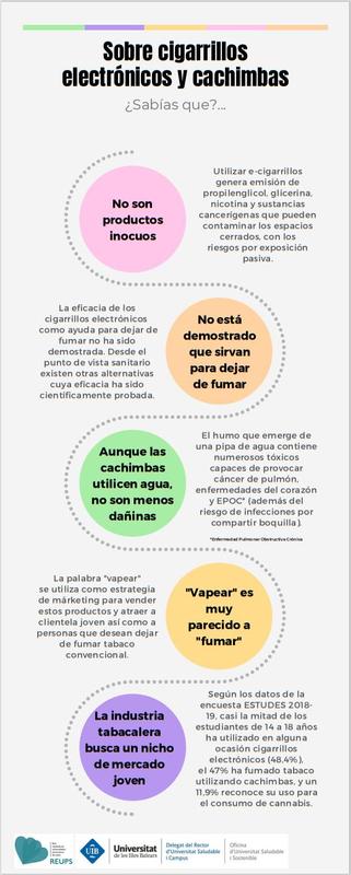 Els cigarrets electrònics NO són innocus, les substàncies que s'inhalen són tòxiques i nocives per a la salut (propilenglicol, nicotina, glicerina, PM2.5). Poden causar càncer, bronquitis crònica i infeccions respiratòries (EPOC).