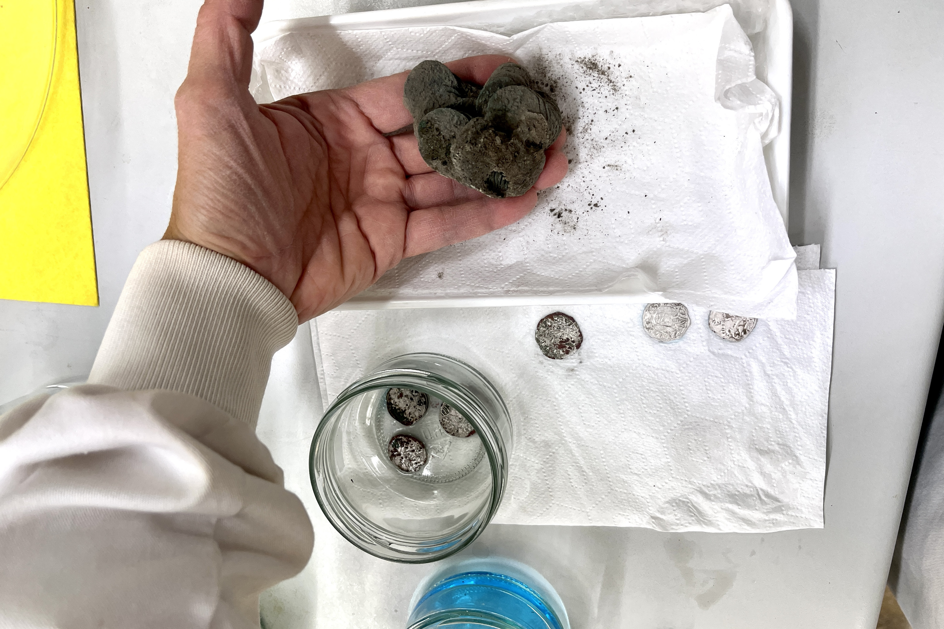 Les peces que les especialistes de la Universitat de Lleida han pogut desempolsegar fins el moment són iguals a algunes recuperades a l'antic call jueu de Lleida i que va netejar el mateix laboratori. Potser entre les que queden per rentar n'hi ha d'altres datacions, però caldrà esperar. "L'oxidació del coure fa que les peces siguin molt fines i això dificulta la seua restauració", afegeix Prats. El material que ha arribat al laboratori de la UdL inclou les restes del recipient de ceràmica i fragments del teixit de l'antiga bossa.