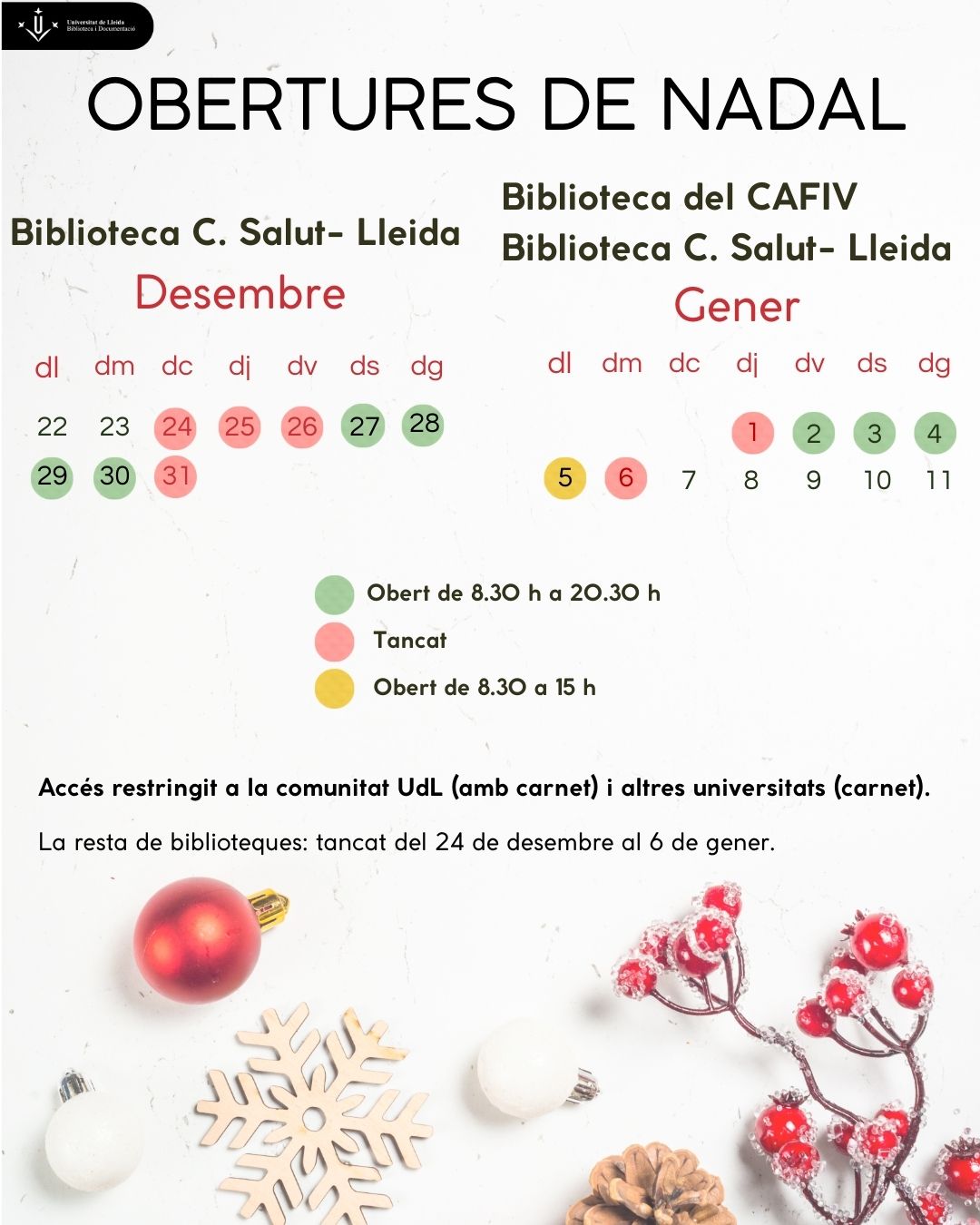 Quant a les biblioteques, la de Ciències de la Salut, amb 219 llocs de lectura, funcionarà a partir del 27 de desembre de 08.30h a 20.30h, mantenint aquest horari tots els dies fins el 4 de gener, tret del 31 de desembre i l'1 de gener, que romandrà tancada. El 5 de gener, vigília de la festivitat de Reis, només prestarà servei durant el matí, de 08.30h a 15.00h. La biblioteca del campus Agroalimentari, Forestal i Veterinari (CAFIV), amb 304 places, funcionarà com a reforç els dies 2, 3 i 4 de gener de 08.30h a 20.30h.