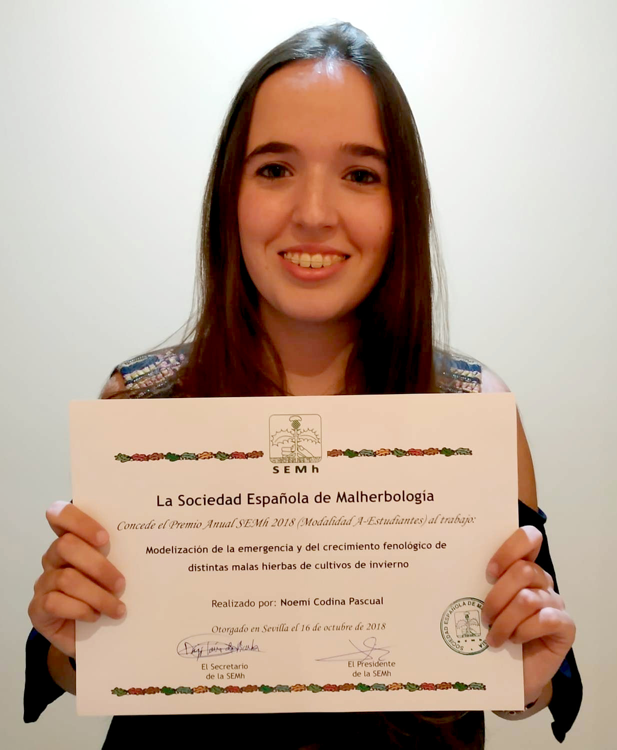 El TFG de Neus Codina, tutoritzat pel professor de l'Escola Tècnica Superior d'Enginyeria Agrària, Aritz Royo, des del Grup de Malherbologia i Ecologia Vegetal, ha estat escollit com el millor treball del curs 2017-2018 per la Societat Espanyola de Malherbologia, en la modalitat de treballs finals de grau i màster.
