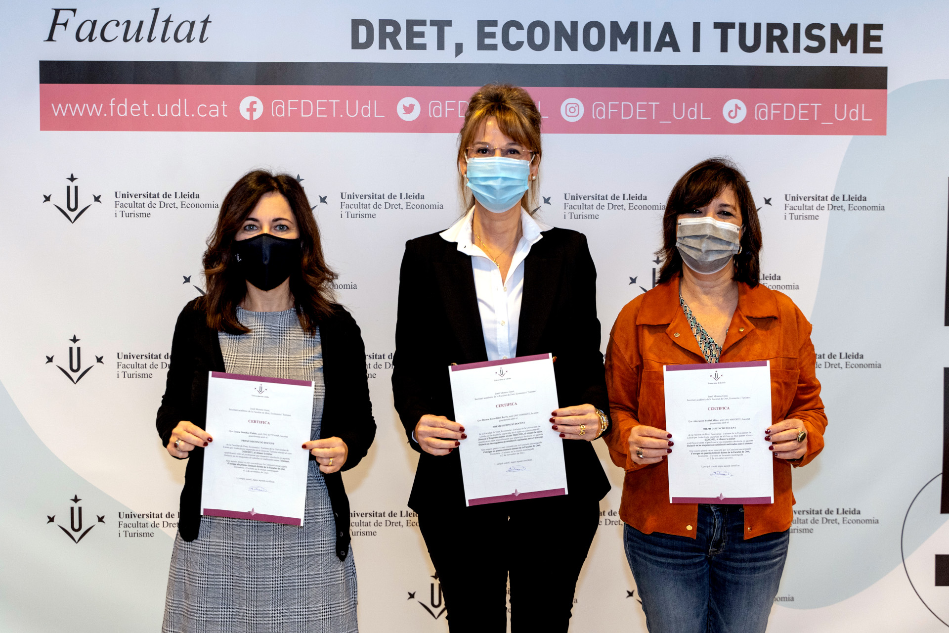 Descarregar pdfBlanca Escardíbul Ferrà, Adoración Padial Albas, i Laura Sánchez Pulido, professores del graus d'Administració d'Empreses (ADE), de Dret, i de Turisme de la Universitat de Lleida (UdL), respectivament, han rebut avui les distincions docents que atorga la Facultat de Dret, Economia i Turisme (FDET). Aquest guardo, que es va crear l'any passat per fomentar la qualitat de la docència i reconèixer la tasca duta pel professorat del centre en cadascun dels graus que imparteix, ha tornat a recaure en tres dones.
