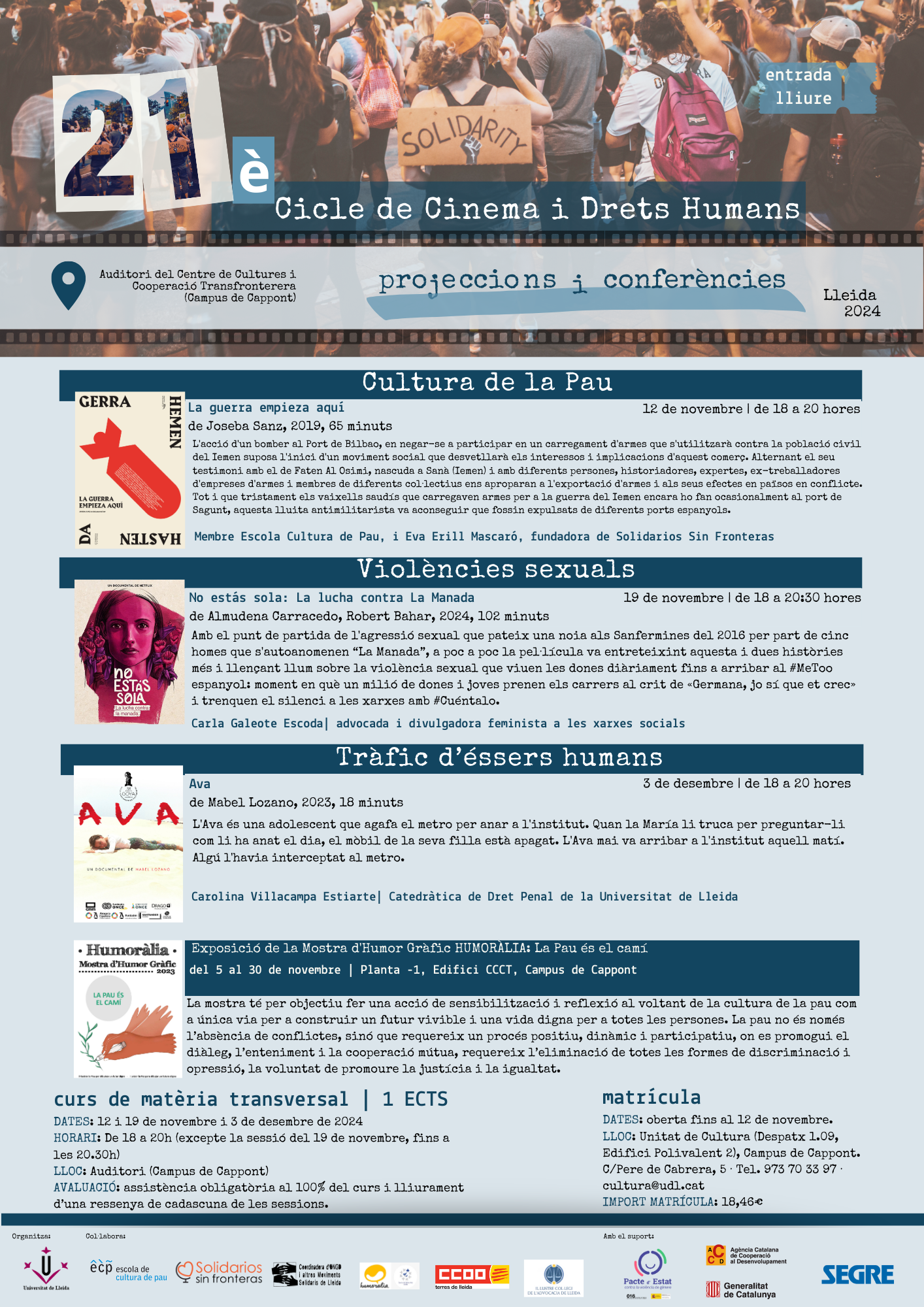 Projecció de: La guerra empieza aquí (Joseba Sanz, 2019, 65 minuts), i posterior debat amb membre d'Escola Cultura de Pau, i Eva Erill Mascaró, fundadora de Solidarios Sin Fronteras; en el marc del 21è Cicle de Cinema i Drets Humans de la UdL.